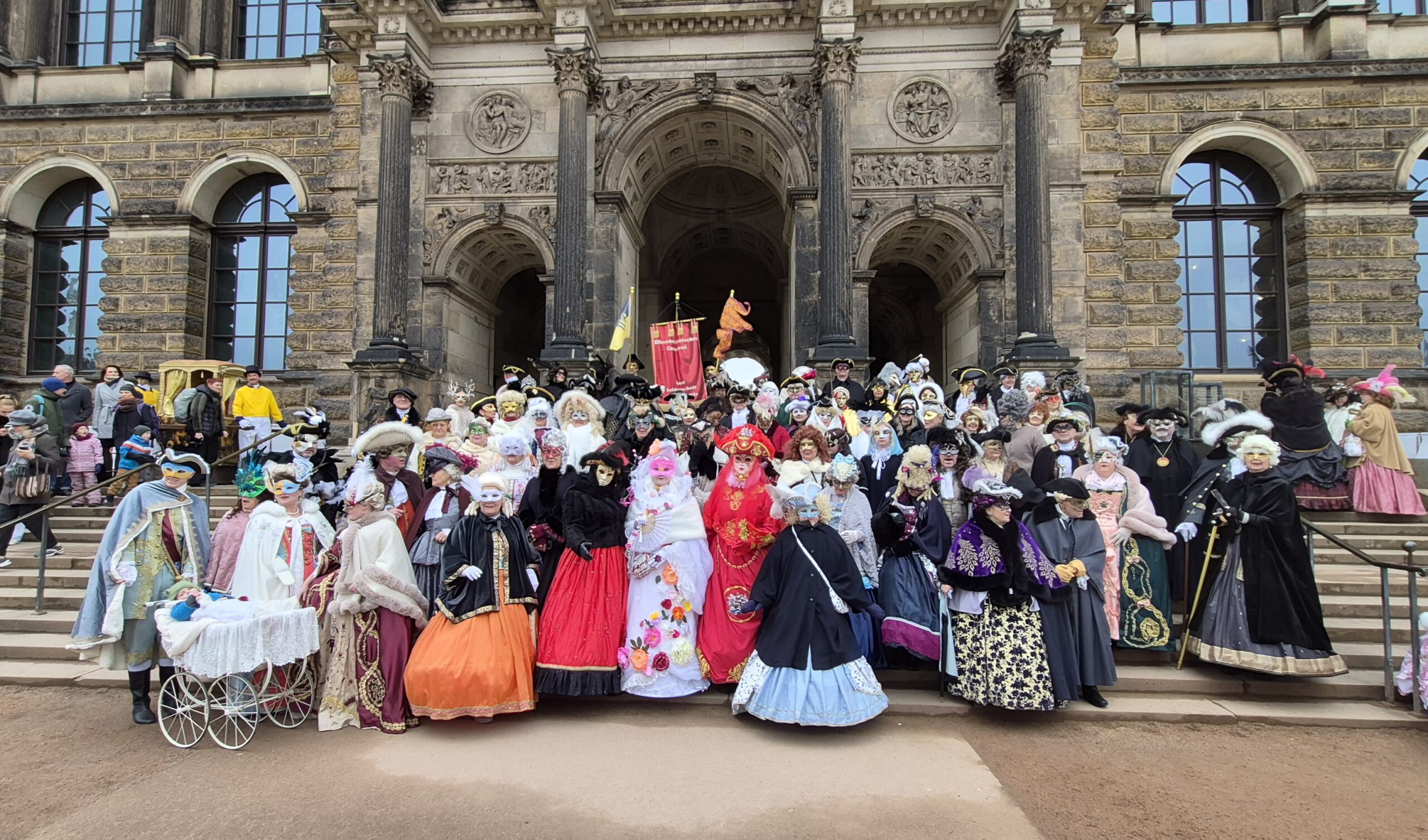 Treffpunkt für das Flanieren beim 3.Elbvenezianischen Carneval war der Neumarkt. Foto: Sylvio DittrichLUST & LEIDENSCHAFT & LEBENSFREUDE – Elbvenezianischer Carneval 2024: Flanieren durch die Schloßstraße. Foto Sylvio DittrichFlanieren beim Elbvenezianischen Carnevals 2024 durch die Schloßstraße. Foto: Anke HerrmannFürstliche Gewänder vor dem Fürstenzug beim 3. Elbvenezianischen Carneval. Foto: Sylvio DittrichGruppenbild der Teilnehmer des 3. Elbvenezianischen Carnevals. Foto Sylvio DittrichFlanieren im Rahmen des 3. Elbvenezianischen Carnevals auf der Brühlschen Terrasse. Foto Sylvio DittrichGruppenfoto des Elbvenezianischen Carnevals 2024im Brühlschen Garten. Foto Sylvio DittrichBarocke Roben vor der barocken Frauenkirche beim Elbvenezianischen Carneval 2024. Foto: Sylvio DittrichTeilnehmer des 3.Elbvenezianischen Carnevals im Brühlschen Garten. Foto Sylvio DittrichLesung im Kügelgenhaus zum Elbvenezianischer Carneval – Foto: Christoph Münch